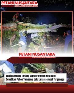 Poin Penting: Angin kencang menyebabkan pohon anggrung tumbang di Jalan Raya Cangar, Desa Sumberbrantas, Kota Batu. Lalu lintas sempat terganggu. Tak ada korban jiwa dalam kejadian itu www.PetaniNusantara.com.ǁJawaTimur,6 Oktober 2025-Angin kencang menerjang Desa Sumberbrantas, Kecamatan Bumiaji, Kota Batu, Jawa Timur, pada Minggu (5/10/2025) malam. Akibatnya, satu pohon berukuran besar dengan diameter 1,8 meter dan tinggi 30 meter tumbang. Pohon jenis anggrung itu tumbang hingga menutup…